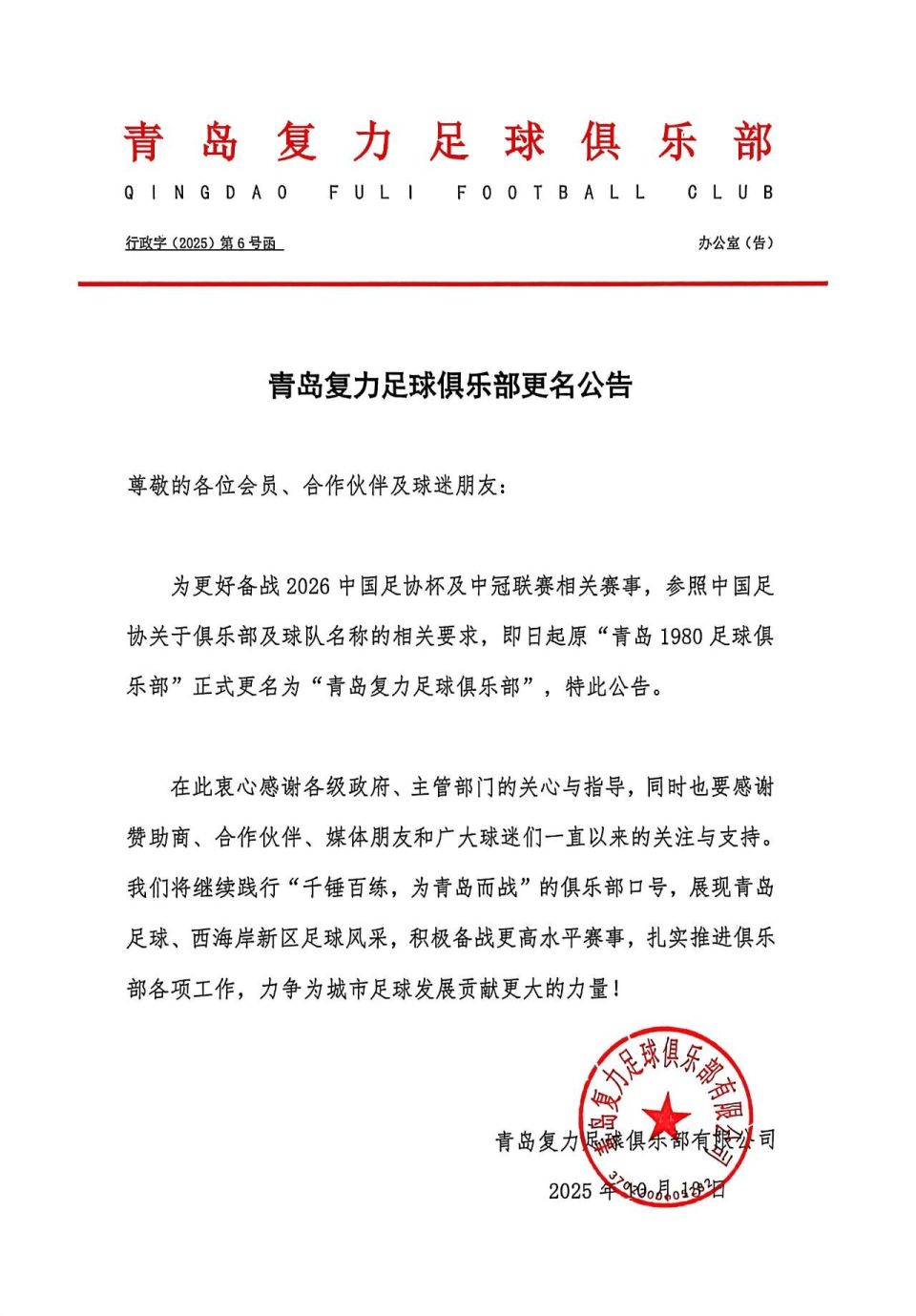 今年先后获得青岛市足协杯赛冠军和青岛城市足球超级联赛亚军的青岛1980足球俱乐部,昨天傍晚发布重磅公告:为更好备战2026中国足协杯赛及中国足协会员协会冠军联赛等相关赛事,参照中国足协关于俱乐部及球队名称的相关要求,即日起原“青岛1980足球俱乐部”正式更名为“青岛复力足球俱乐部”。接下来,青岛复力足球俱乐部将继续践行“千锤百练,为青岛而战”的俱乐部口号,展现青岛足球、西海岸新区足球风采,积极备战更高水平赛事,扎实推进俱乐部各项工作,力争为城市足球发展贡献更大的力量。值得注意的是,去年,深圳二零二八以中冠冠军身份冲乙成功。在本赛季中乙还剩2轮比赛的情况下,暂居争冠组第三的深圳二零二八比位列次席的无锡吴钩少3分,仍有机会冲甲成功。而前天,厦门壹零贰陆在2:0力克黔西南栩烽棠后,以5胜2平佳绩获得中冠总决赛南区头名,凭此获得下赛季中乙席位。明年,青岛复力能否像青岛红狮和青岛西海岸那样,通过在中冠取得佳绩为“足球城”青岛再添一支职业男足?我们拭目以待!▲今年5月18日,青岛复力(前身为青岛1980)在天泰体育场捧起抖音足球嘉年华青岛站暨2025年青岛市足协杯赛冠军奖杯并收获5万元的巨额奖金。青岛籍演艺明星、中国电影家协会副主席黄渤,青岛籍4枚奥运金牌得主陈梦出席颁奖仪式。