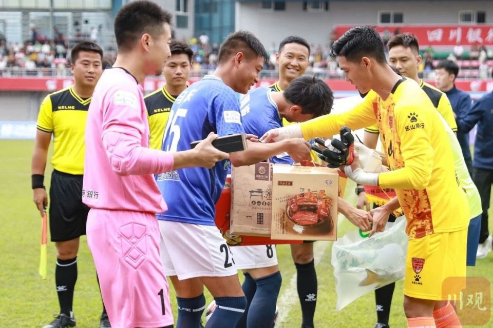 如果说送给球迷们的福袋是“小样礼盒”,那么双方队长提起特产进场则是“川超标配”。双方球员进场的头件事早就不是“放狠话”,而是交换各自城市的土特产。你送我甜皮鸭、钵钵鸡,我就还你雅鱼、雅鸡;你请我吃高原牦牛肉,我也回礼当地自产火锅底料。球迷之间送的礼物就更豪横了:川南两虎自贡和宜宾,都掏出了家乡最能撑场面的美食,自贡的火边子牛肉、牛佛烘肘,还有宜宾美酒,情义都藏在酒和菜里。